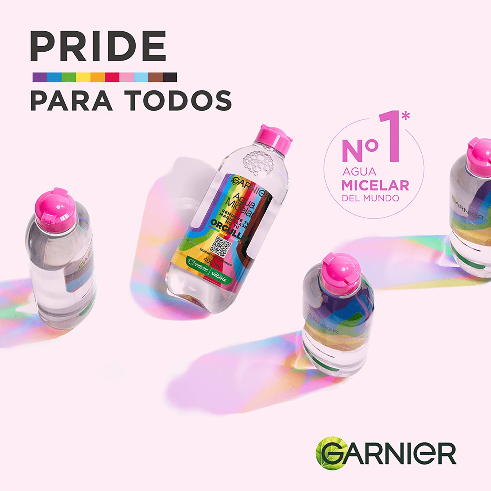 Garnier celebra el Orgullo los 365 días del año con nuestro icono rosa, el Agua Micelar, se viste de la bandera multicolor. Limpia tus miedos, Desmaquilla tus inseguridades y Celebra tu Orgullo con la edición limitada de Agua Micelar Clásica.