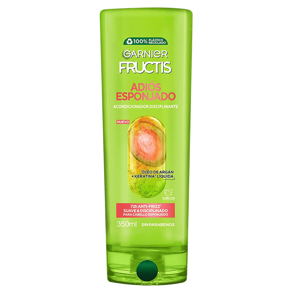 Acondicionador Fructis Adiós Esponjado con Óleo de argan y Keratina líquida para controlar el frizz hasta por 72 horas dejando un pelo suave y disciplinado.