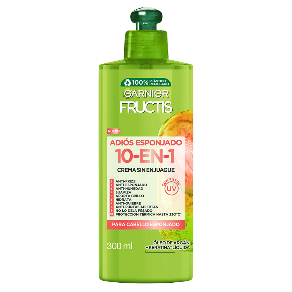 Crema para Peinar 10en1 de Garnier Fructis Adiós Esponjado. Suaviza y controla el frizz hasta por 72 horas. Pelo suave y disciplinado incluso bajo 85% de humedad.1 Para cabello liso, ondulado y rizado. 1 Test instrumental usando shampoo + crema sin enjuague 10en1 vs shampoo clásico.