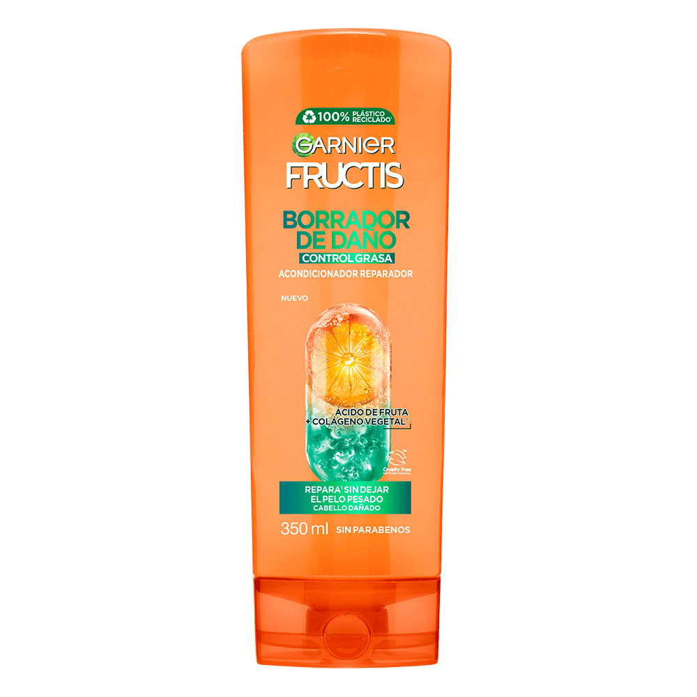 Nuevo Fructis Borrador de Daño Acondicionador Reparador con Ácido de Fruta y Colágeno. Ayuda a Sellar la Fibra Dañada, Combatiendo el Daño, Aportando Suavidad e Hidratación, Mientras Controla la Oleosidad Sin Resecar. Fórmula Libre de Parabenos y Libre de Siliconas. Apto Para Cabello Dañado con Raíces Grasas.