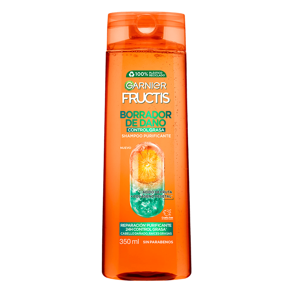 Nuevo Fructis Borrador de Daño Shampoo Purificante con Ácido de Fruta y Colágeno. Ayuda a Sellar la Fibra Dañada, Combatiendo el Daño, Aportando Suavidad e Hidratación, Mientras Controla la Oleosidad Sin Resecar. Fórmula Libre de Parabenos y Libre de Siliconas. Apto Para Cabello Dañado con Raíces Grasas.